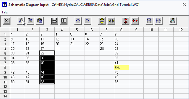 Move the cursor to column 7 and row 5. Press the Paste button. These nodes are at the top of the riser nipples and now are more clearly shown to be connected to the Front main.